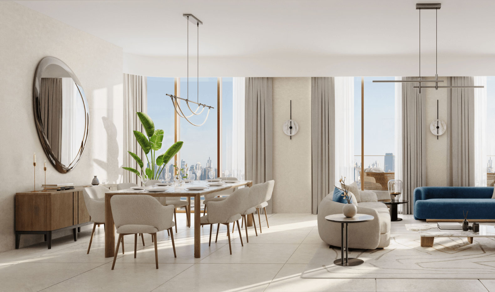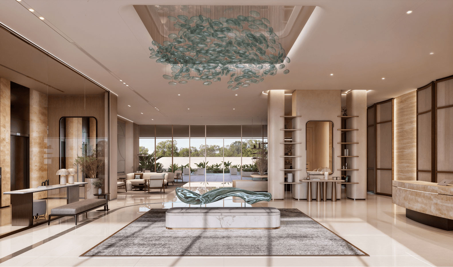 Experience spatially balanced interiors defined by elegant lines and refined finishes. Expansive floor-to-ceiling windows frame sweeping views that emphasize a layered, sophisticated palette of marble, porcelain, warm veneers and soft metallics. From serene living areas to opulent, spa-style bathrooms, every element is designed to elevate and inspire.